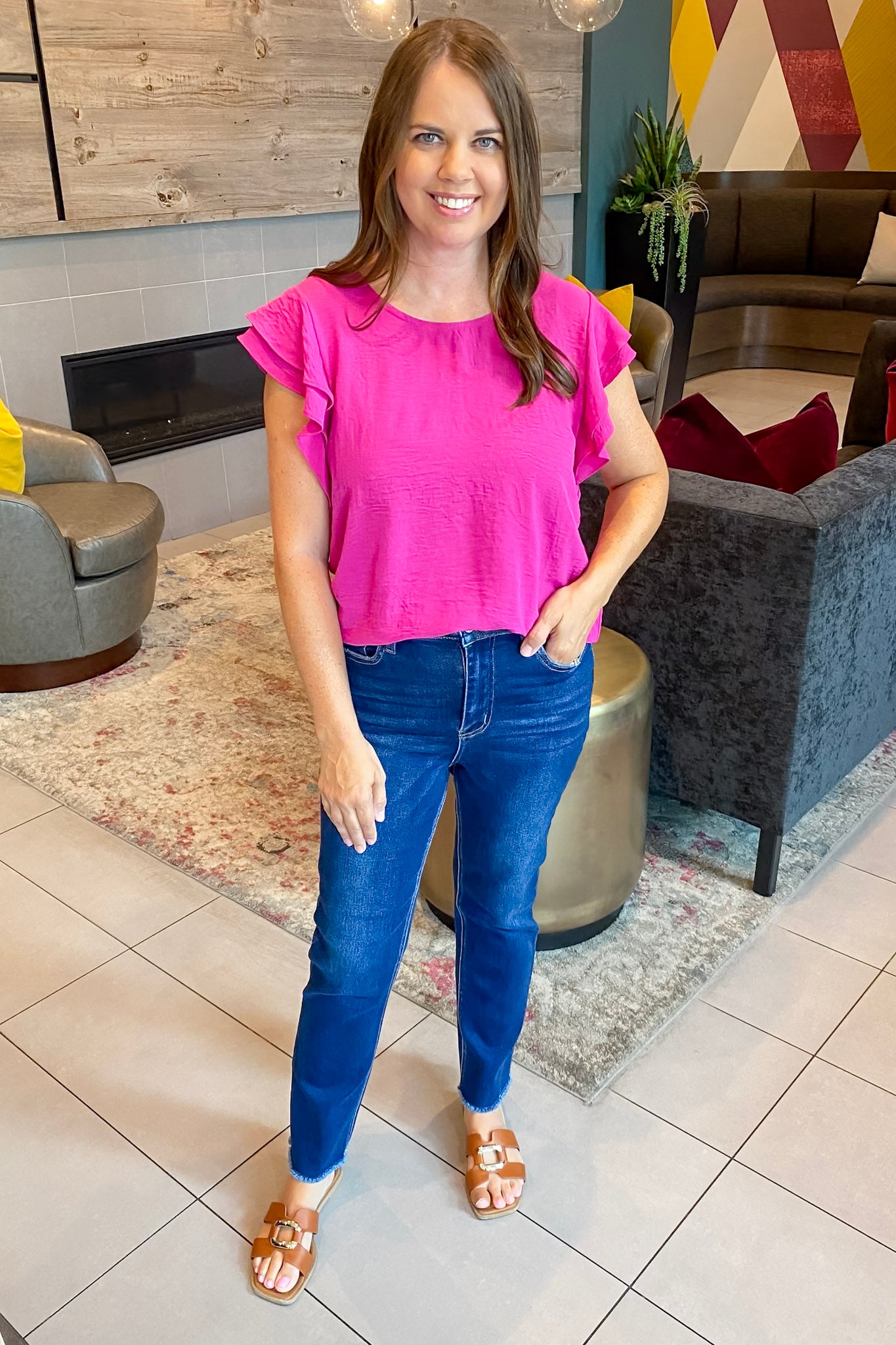 Brighten up your fall wardrobe with this bold, Magenta-toned flutter sleeve top. The soft drape and playful ruffle details make it a standout piece that’s as easy to style as it is to wear. Perfect for transitioning from day to night, this top brings a pop of fun to any autumn outfit.