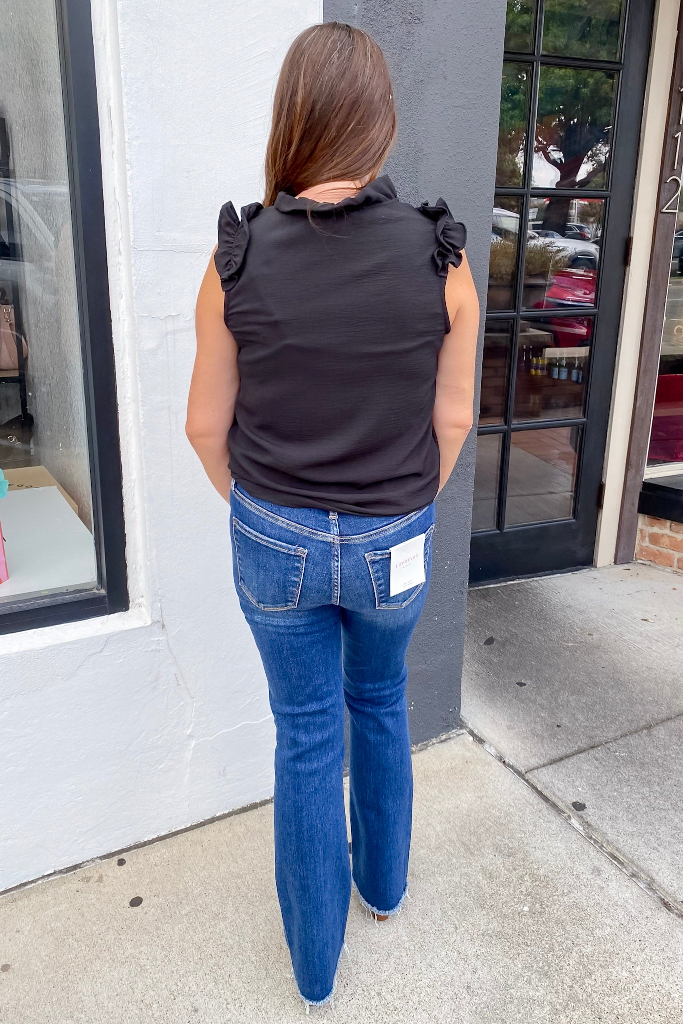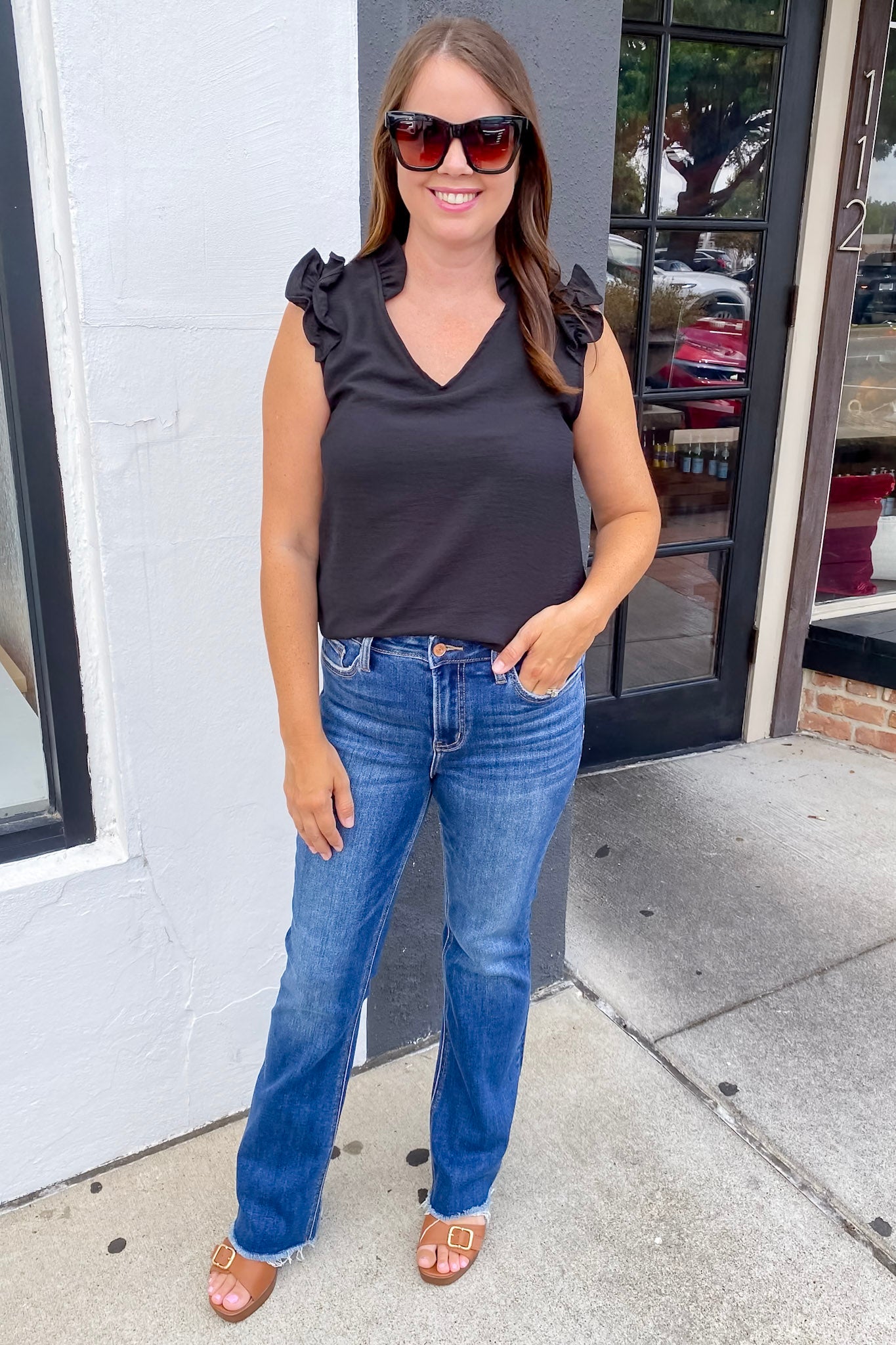 Add a pop of playful polish to your cool-weather wardrobe with the Send an Alert For This Top. Featuring soft ruffled accents at the shoulders, a flattering notched neckline, and a deep black hue that works beautifully for fall into winter. It's flirty, feminine, and just structured enough to dress up or down with ease.