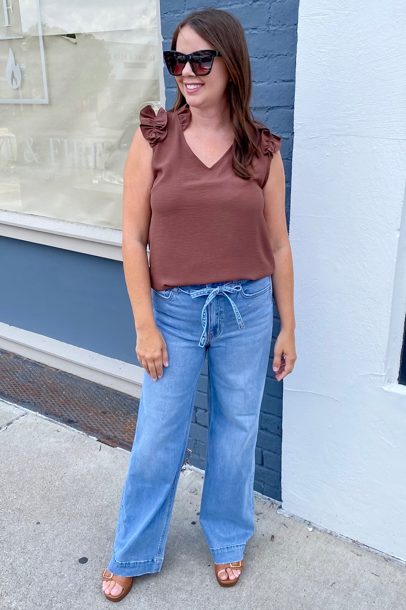 Add a pop of playful polish to your cool-weather wardrobe with the Send an Alert For This Top. Featuring soft ruffled accents at the shoulders, a flattering notched neckline, and a deep brown hue that works beautifully for fall into winter. It's flirty, feminine, and just structured enough to dress up or down with ease.