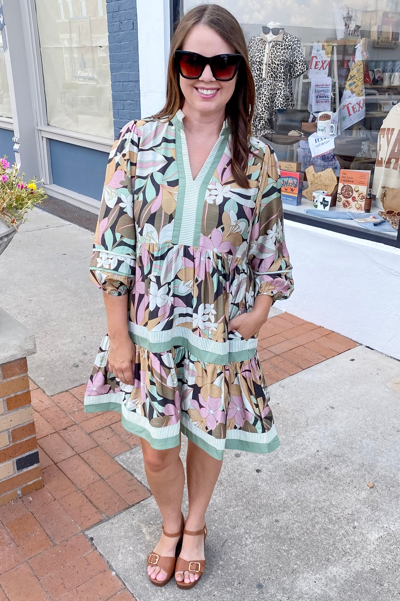 Say hello to your new fall favorite! This tiered dress is a playful mix of warm earth tones and soft pastel pops, framed with sage green trim for just the right touch of contrast. Featuring a flattering V-neckline, subtle puff sleeves, and a flirty swing silhouette, it’s made for twirls, boots, and compliments. Light and flowy, but ready for crisp autumn days—this one is made for fall fun!