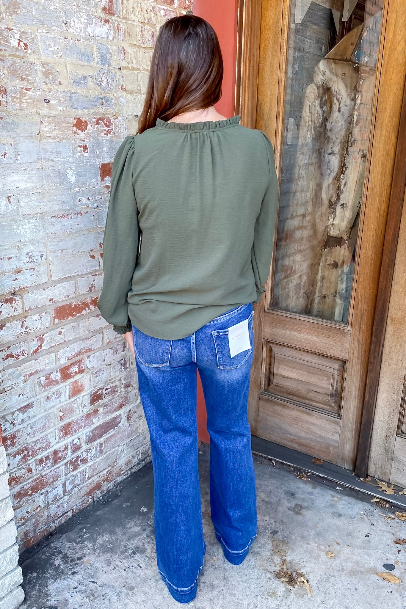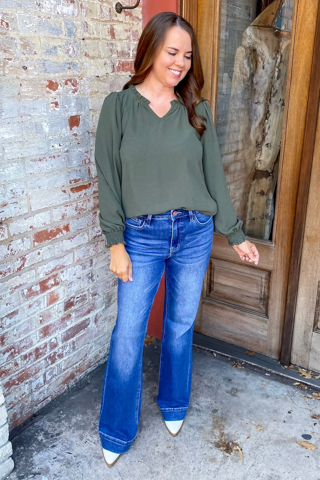 Bring a little fall charm to your wardrobe with this olive green beauty! The soft fabric drapes effortlessly, while the smocked cuffs and subtle ruffle neckline give it a sweet, feminine touch. Lightweight and flattering, it’s the perfect top for layering or wearing solo when you want to feel cute and comfy all season long.
