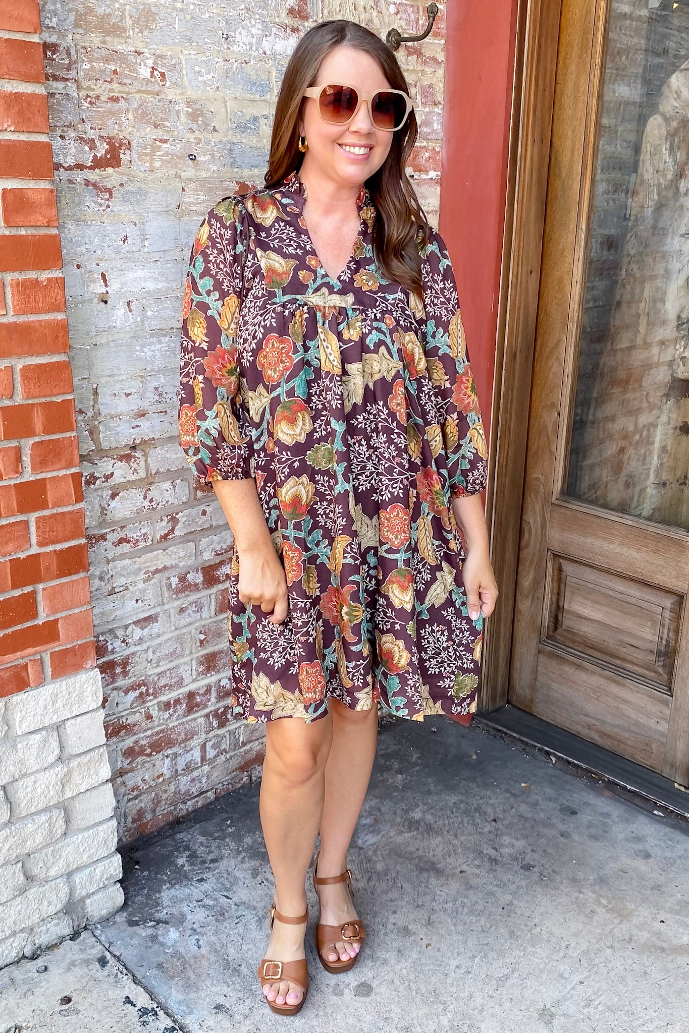 Meet the Take A Stroll Floral Print Brown Dress—your new fall favorite with just the right amount of flair. Featuring a rich cocoa brown base adorned with warm, autumn-inspired florals, this flowy silhouette is designed with soft puff sleeves, a gathered bodice, and a sweet notch neckline that gives it a playful touch. Lightweight but lined enough to keep cozy, this dress is as comfy as it is cute!