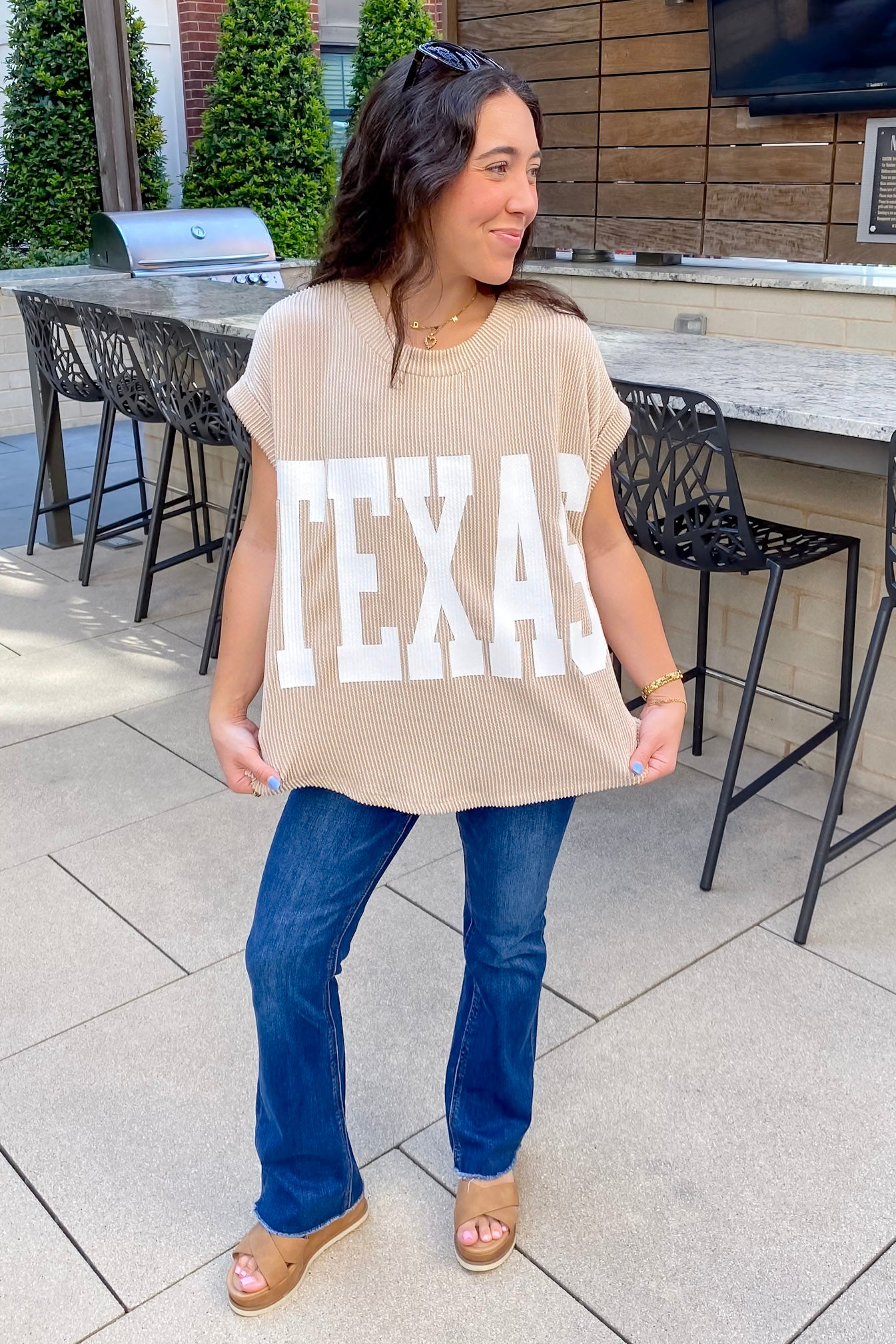 Big T-E-X-A-S energy! This soft, ribbed knit top is made for repping your roots in the cutest way possible. With bold varsity lettering and an easy, relaxed fit, it’s your new fall fave for cheering on your team or just giving your outfit a sporty twist. Sleeveless, lightweight, and neutral-toned—it’s the kind of piece that makes a bold statement with minimal effort.