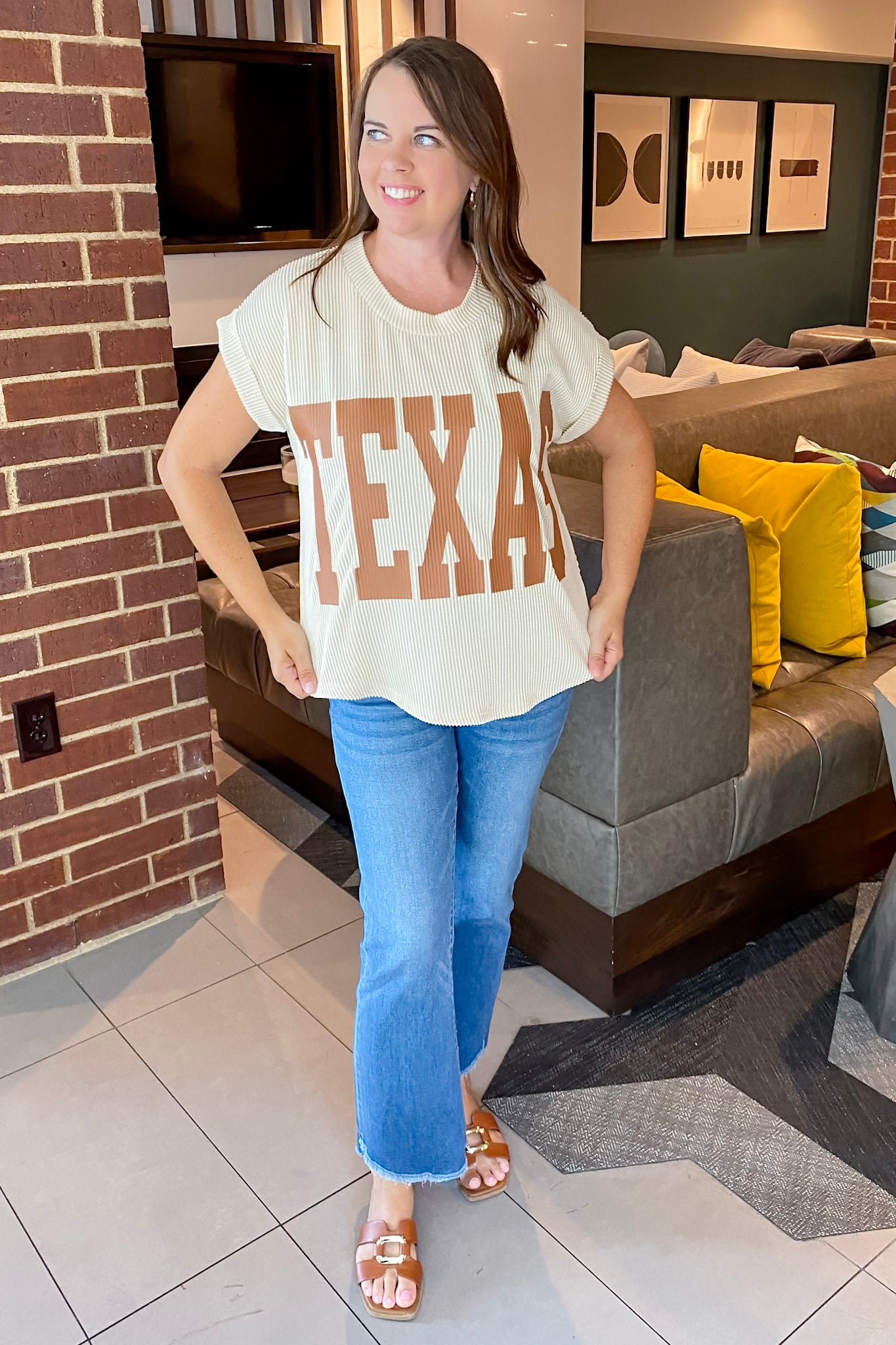 Big T-E-X-A-S energy! This soft, ribbed knit top is made for repping your roots in the cutest way possible. With bold varsity lettering and an easy, relaxed fit, it’s your new fall fave for cheering on your team or just giving your outfit a sporty twist. Sleeveless, lightweight, and neutral-toned—it’s the kind of piece that makes a bold statement with minimal effort.