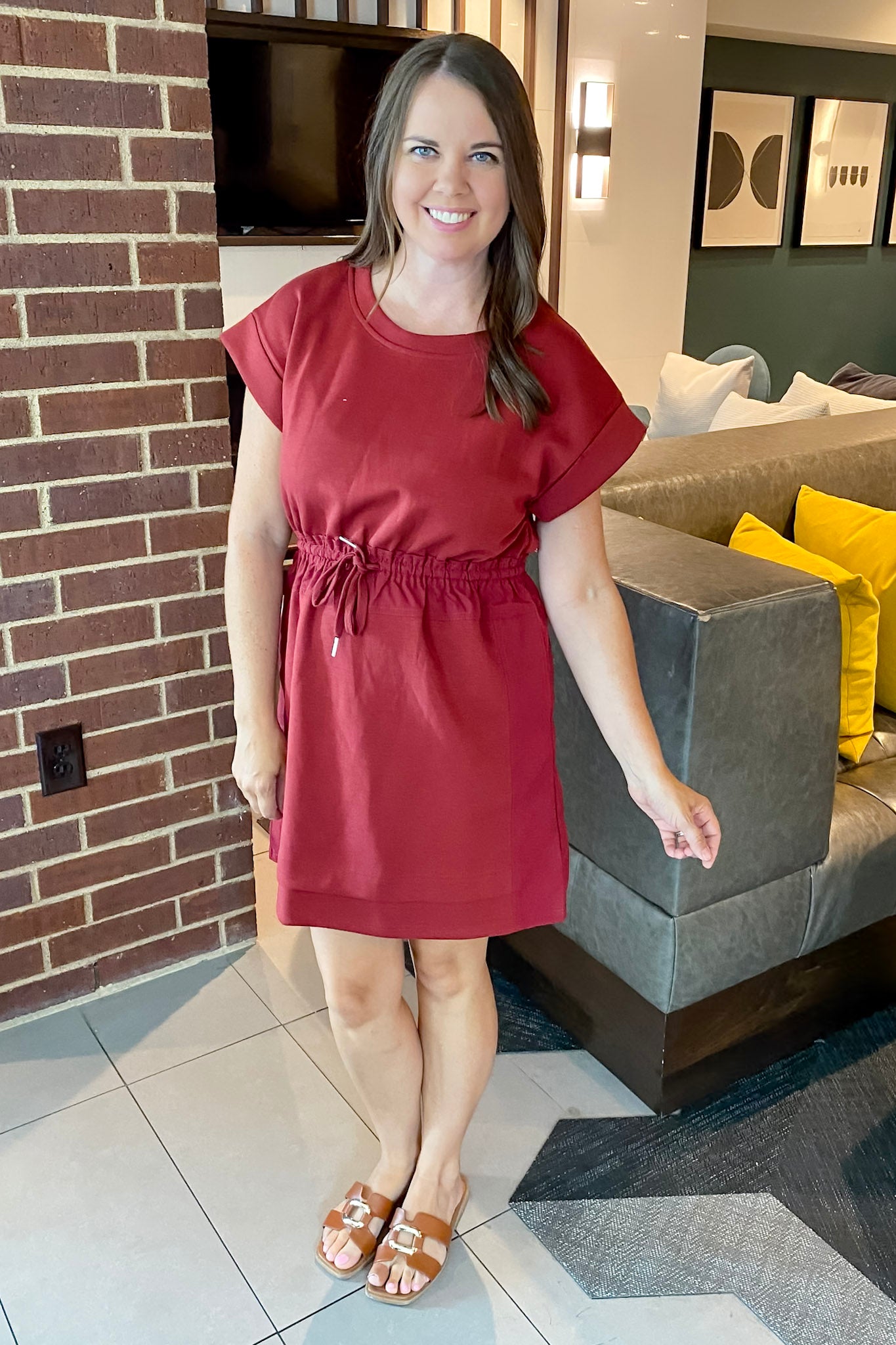 This burgundy dress features a relaxed silhouette with rolled-up short sleeves, a cinched drawstring waist for a flattering fit, and practical pockets for ultimate convenience. The casual yet polished design makes it an easy-to-wear staple, perfect for everyday styling while maintaining effortless elegance.