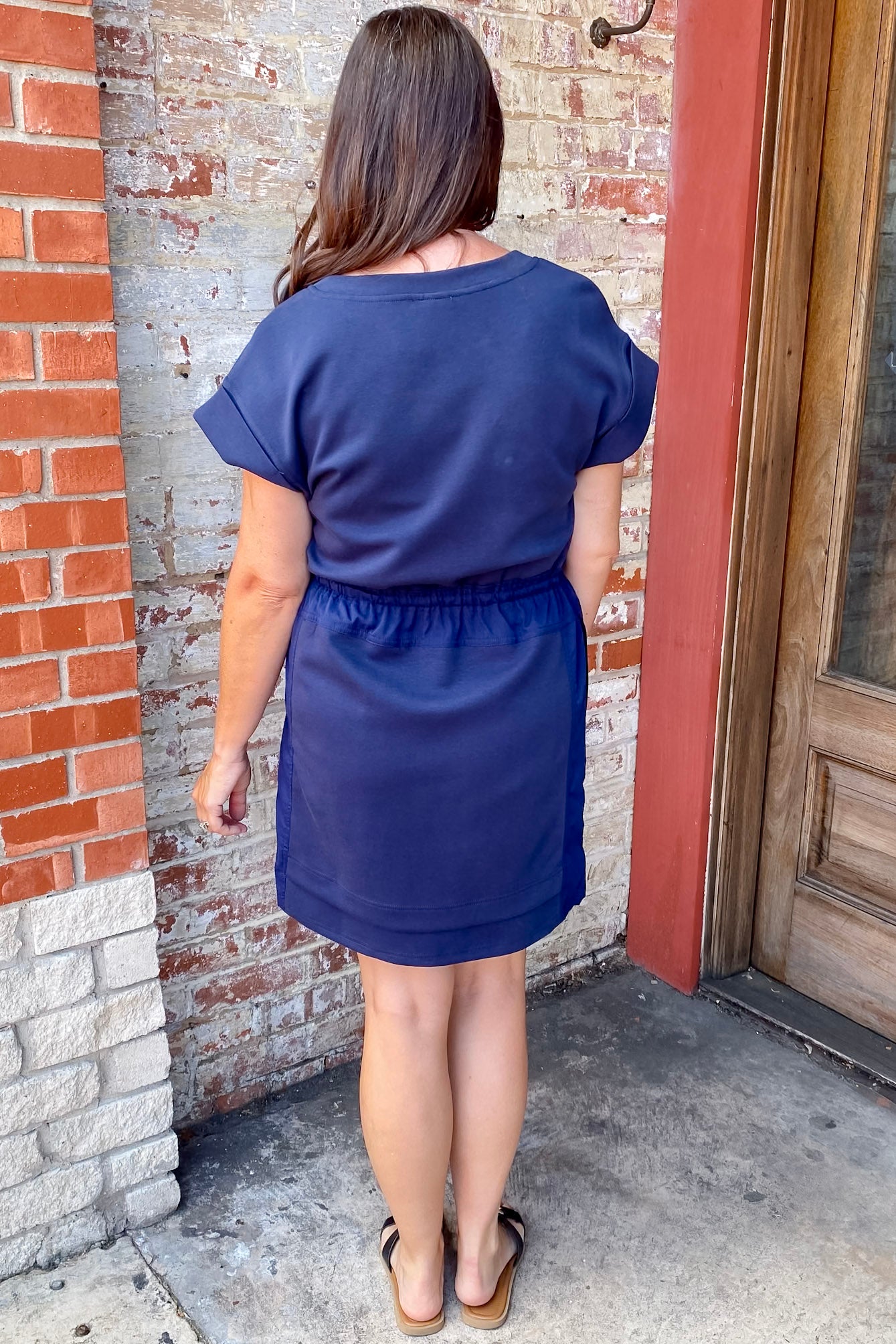 This navy dress features a relaxed silhouette with rolled-up short sleeves, a cinched drawstring waist for a flattering fit, and practical pockets for ultimate convenience. The casual yet polished design makes it an easy-to-wear staple, perfect for everyday styling while maintaining effortless elegance.