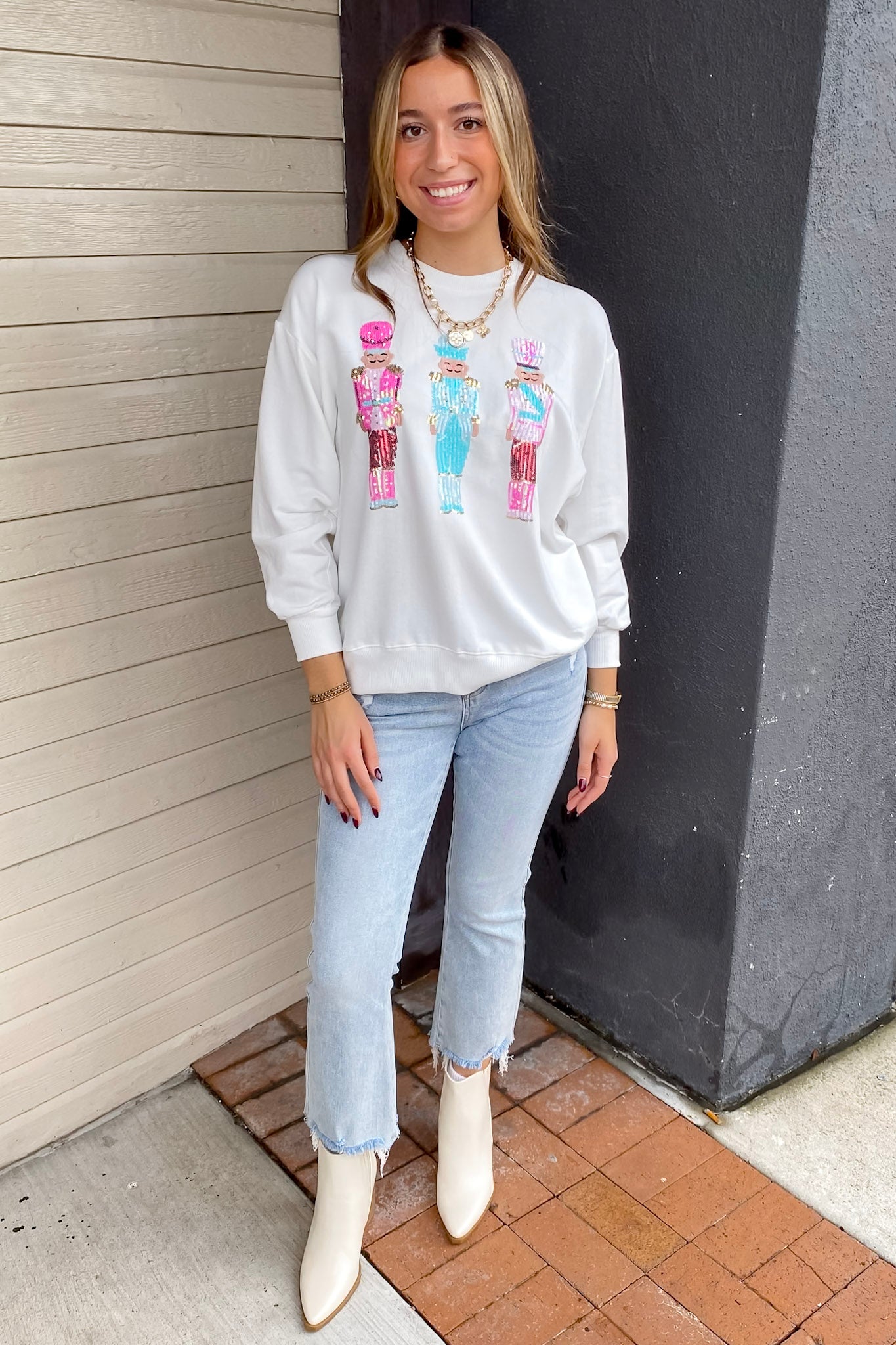 Embrace your individuality with our Three Nutcrackers Christmas White Sweater from Mary Square. Featuring a classic crew neckline, relaxed drop shoulders, and ribbed trim, it offers a comfortable, relaxed fit perfect for holiday gatherings, winter outings, or cozy days at home. Soft, snuggly, and full of festive charm, the Holiday Sarah Sweatshirt is a seasonal must-have for your wardrobe.