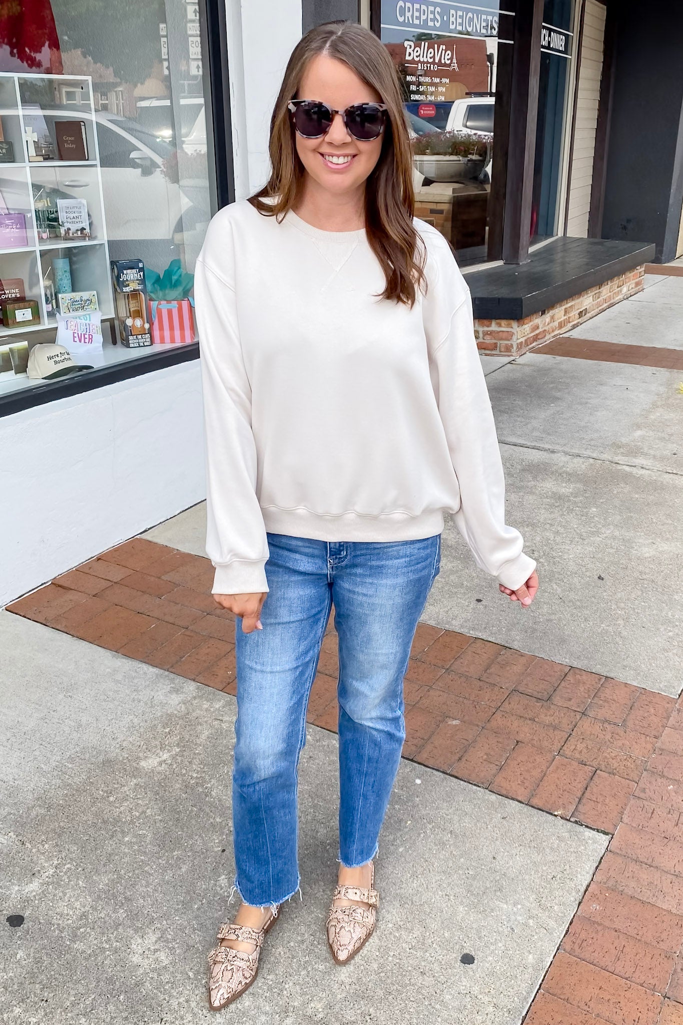 Say hello to your new favorite throw-on-and-go layer! The Cozy Up Crewneck Sweatshirt in soft ecru brings effortless comfort and laid-back style together. Designed with a relaxed fit, ribbed cuffs, and that classic V-stitch neckline detail, this pullover has just the right amount of structure while still feeling totally relaxed. It's the perfect neutral for fall layering—easy to dress up or down.