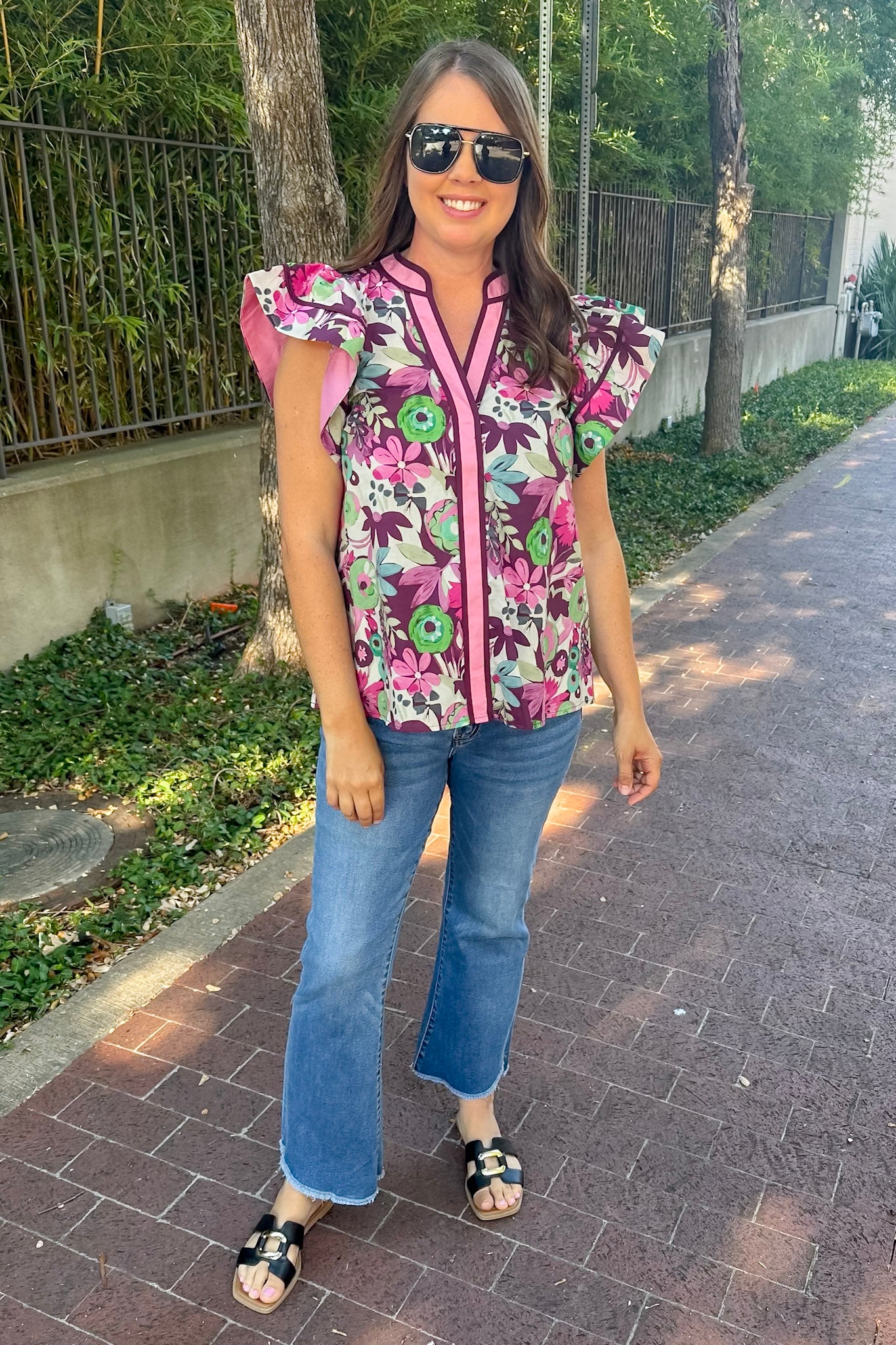 Vibrant and playful, this bold floral top is made to stand out. Featuring structured flutter sleeves, a sleek V-neckline with contrast trim, and a flowy fit, it’s the perfect mix of fun and feminine. The eye-catching print makes it an easy statement piece for any occasion.