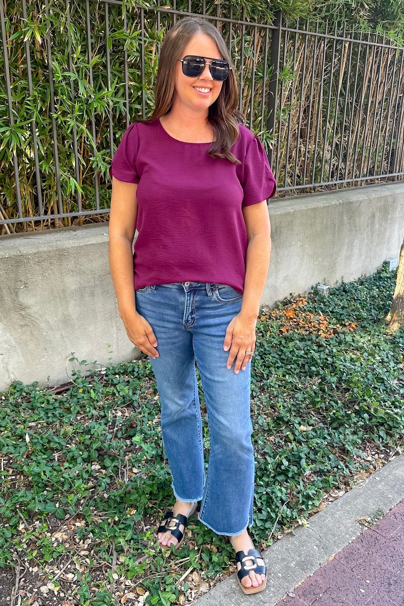 Easygoing yet stylish, this burgundy-toned short-sleeve top is perfect for crisp fall days. The soft, lightweight fabric drapes effortlessly, making it a great layering piece or stand-alone essential. Its relaxed fit pairs perfectly with denim or cozy outerwear, giving you endless outfit possibilities this season.