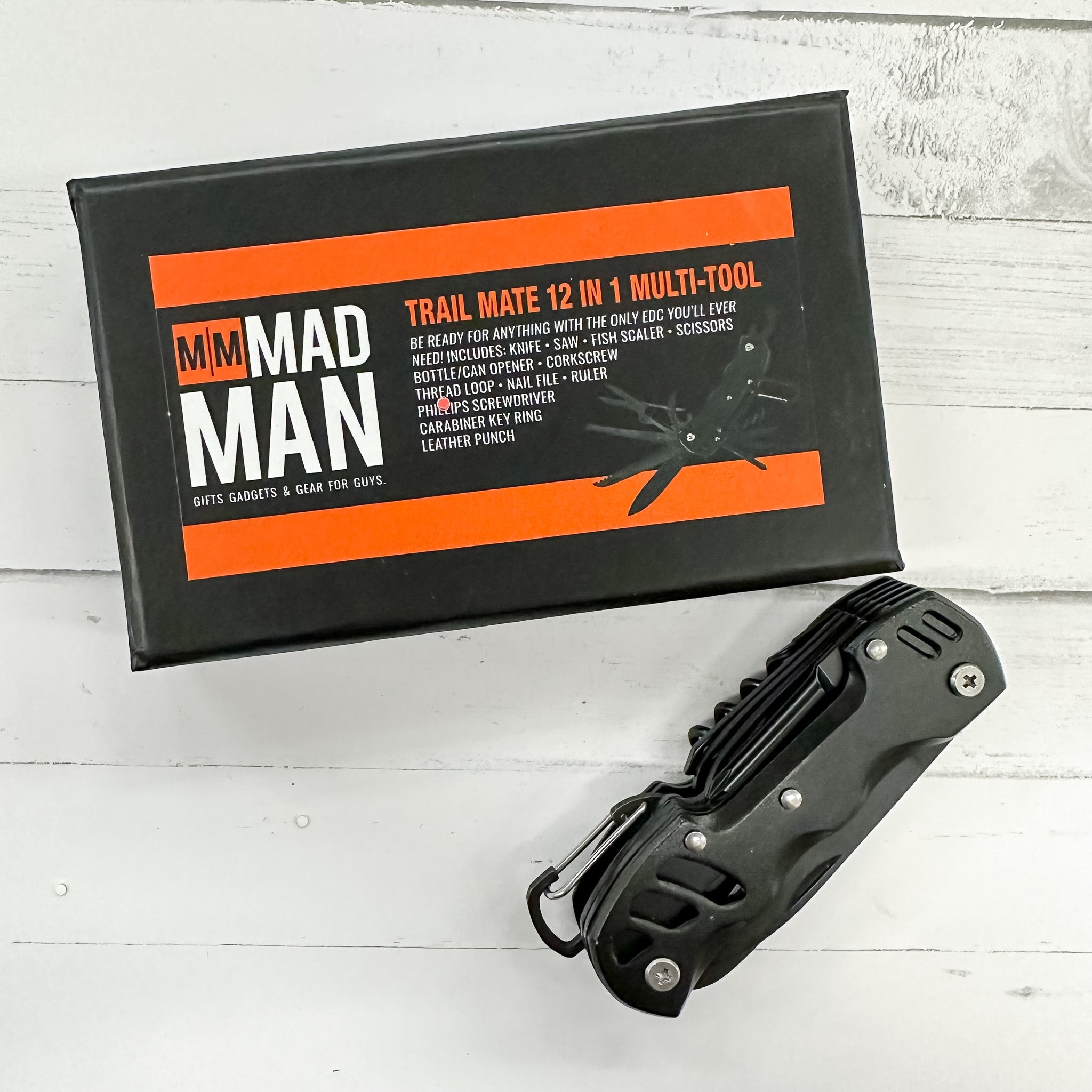INCLUDES: knife, saw, fish scaler, scissors, bottle and can opener, corkscrew, thread loop, nail file, ruler, Philips screwdriver, carabiner key ring, and leather punch