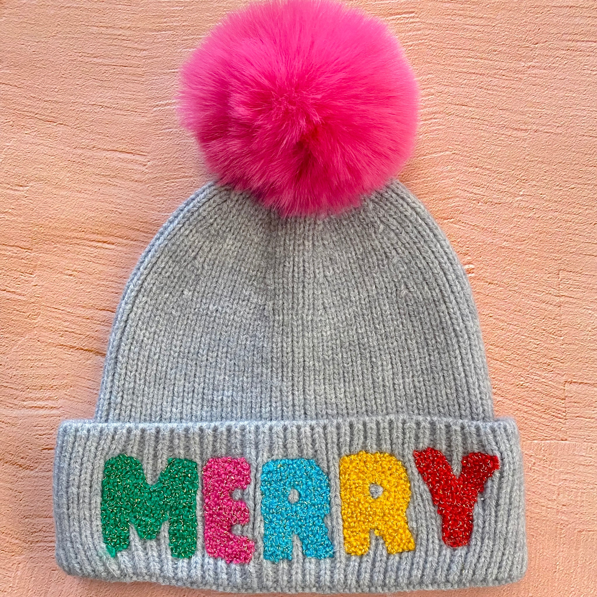 Turn up the cheer with the “Merry” Beanie, your new favorite cold-weather statement piece. This cozy knit features bold, multicolored lettering and a bright faux fur pom that brings instant joy to any winter outfit. The cuffed design keeps your ears snug, while the playful vibe spreads smiles everywhere you go. Whether you're heading out for holiday shopping or sipping cocoa with friends, this beanie brings the merry wherever you wear it.